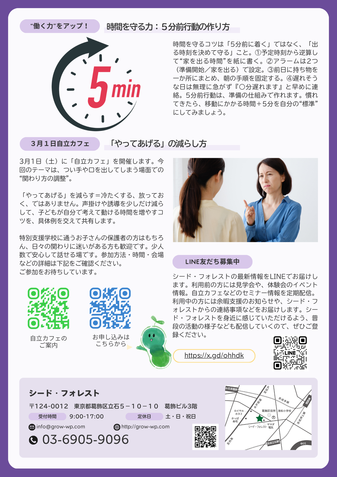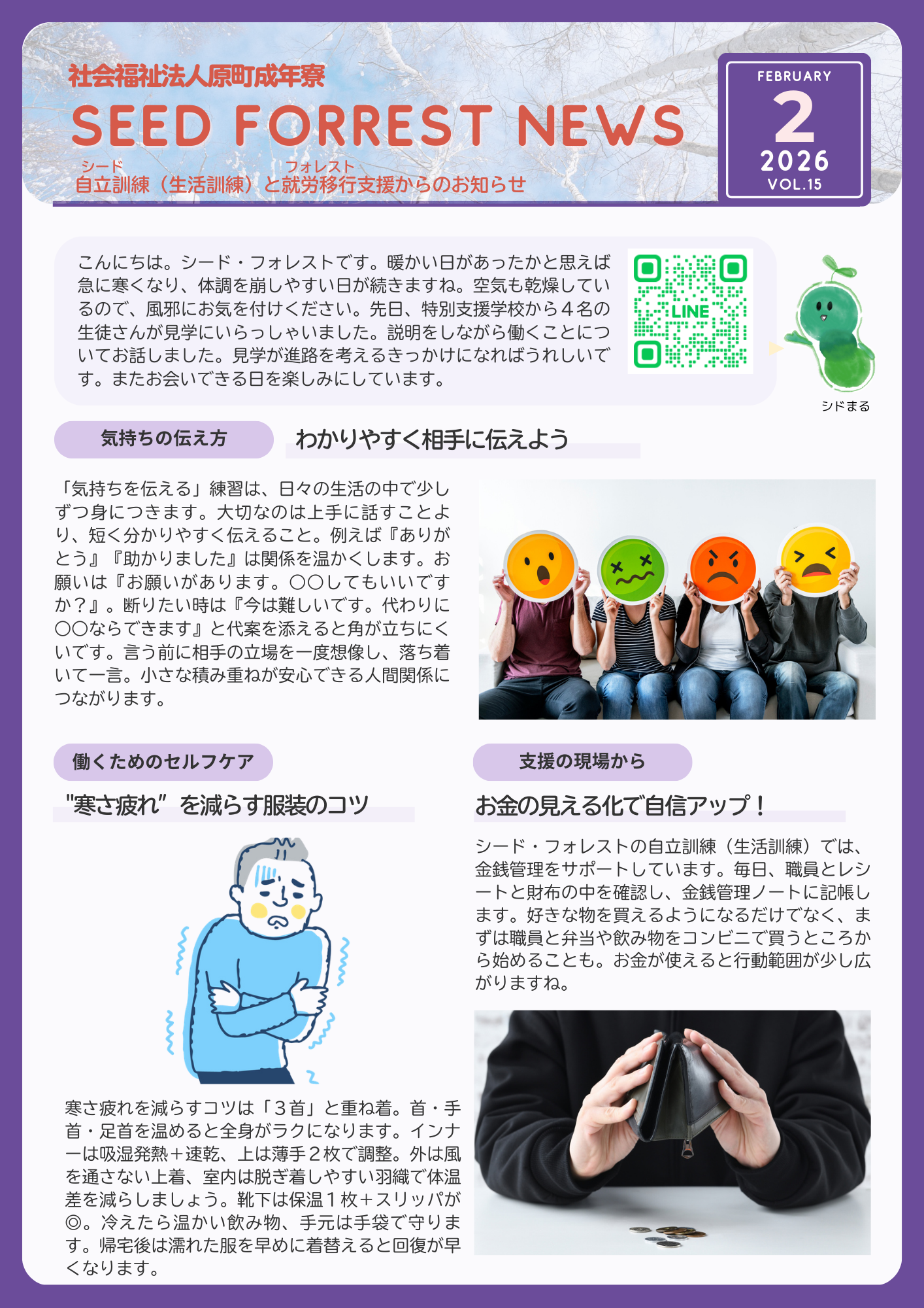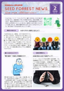 トップページ > お知らせ一覧 > ニュースレター2月号 2026.02.19 thu. ニュースレター2月号ニュースレター ニュースレター2月号 2026.02.19 thu. ニュースレター 先週は寒い日が続きましたが、今週に入ってから日中は少し気温が上がって暖かい日もありましたね。 こんな時は体調を崩しやすくなるので、みなさん体調を崩さないように気を付けてください。 ニュースレター2月号をお届けします。 最新の投稿 ニュースレター2月号 余暇支援のお知らせ 4月18日(土) ニュースレター1月号 余暇支援のお知らせ 3月14日(土) ニュースレター12月号 カテゴリー イベント お知らせ ニュースレター フォレスト週末通信 余暇支援 未分類 アーカイブ 月を選択してください 2026年2月 (2) 2026年1月 (2) 2025年12月 (1) 2025年11月 (1) 2025年10月 (1) 2025年9月 (3) 2025年8月 (1) 2025年7月 (2) 2025年6月 (2) 2025年5月 (1) 2025年4月 (3) 2025年3月 (1) 2025年2月 (5) 2025年1月 (3) 2024年12月 (2) 2024年11月 (2) 2024年10月 (3) 2024年9月 (1) 2024年8月 (2) 2024年7月 (1) 2024年6月 (2) 2024年5月 (2) 2024年4月 (2) 2024年3月 (2) 2024年2月 (2) 2024年1月 (2) 2023年12月 (2) 2023年11月 (2) 2023年10月 (2) 2023年9月 (2) 2023年8月 (2) 2023年7月 (3) 2023年6月 (2) 2023年5月 (2) 2023年4月 (3) 2023年3月 (1) 2023年2月 (2) 2023年1月 (2) 2022年12月 (2) 2022年11月 (2) 2022年10月 (2) 2022年9月 (2) 2022年8月 (2) 2022年7月 (2) 2022年6月 (3) 2022年5月 (2) 2022年4月 (2) 2022年3月 (2) 2022年2月 (2) 2022年1月 (2) 2021年12月 (2) 2021年11月 (3) 2021年10月 (1) 2021年9月 (2) 2021年8月 (2) 2021年7月 (2) 2021年6月 (2) 2021年5月 (3) 2021年4月 (2) 2021年3月 (1) 2021年1月 (1) 前の記事へ 一覧に戻る